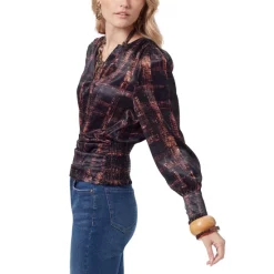 An abstract spin on plaid patterning with a stylish sheen, Sam Edelman’s Edith top is pleated at the front and smocked at the back of its wide waistband.